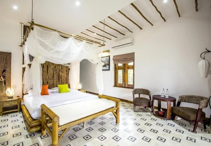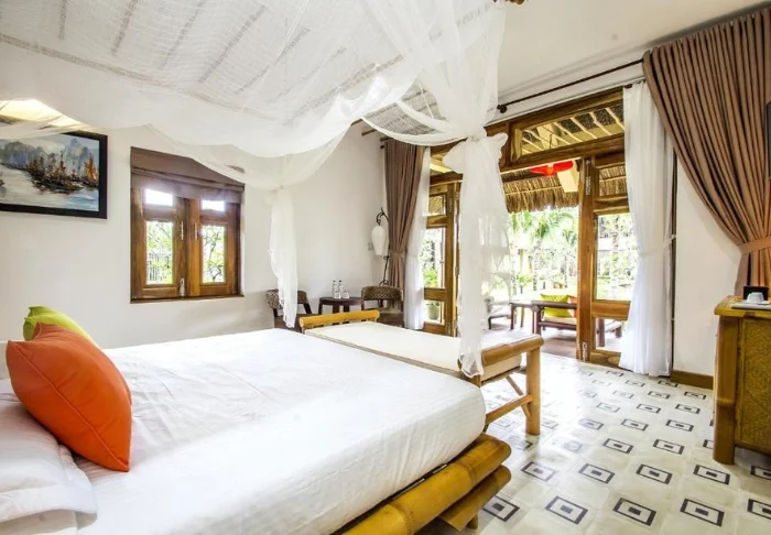 You’ll stay in a superior room, decorated in a Vietnamese style with dark wood furnishings that create a warm and inviting atmosphere. The rooms come equipped with modern conveniences such as air conditioning, Wi-Fi, a minibar, tea and coffee-making facilities, a safety box, and a flat-screen TV, offering everything you need for a comfortable stay. The bathroom features a shower, bathrobe, hairdryer, and toiletries.