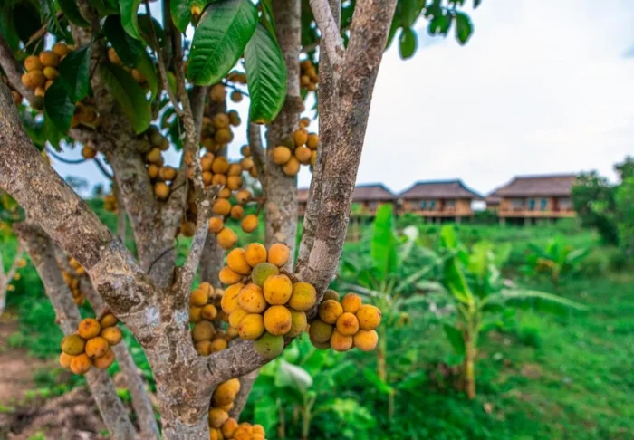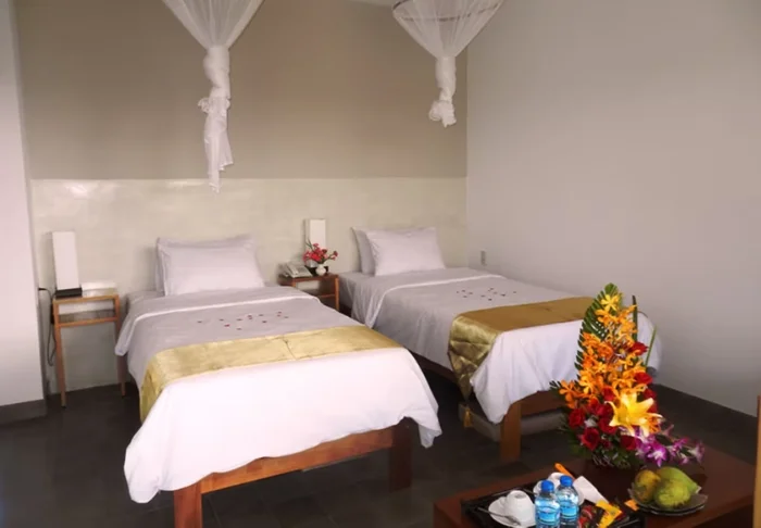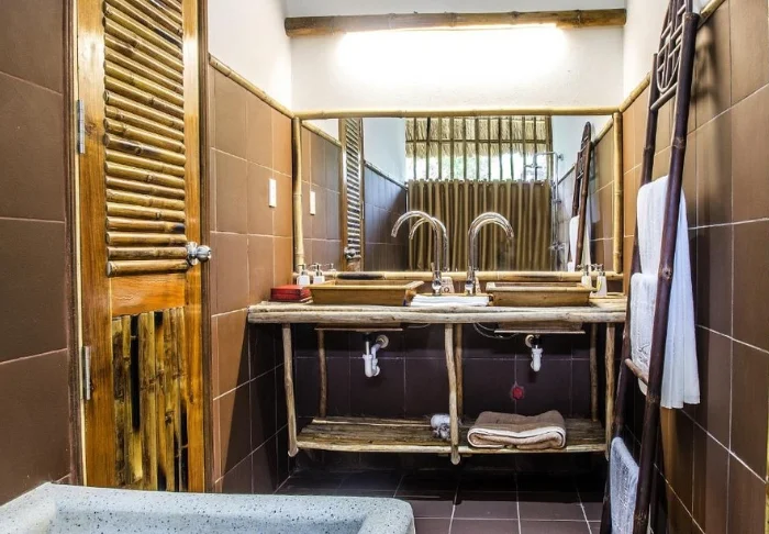 You’ll stay as standard in a deluxe bungalow built on stilts. The décor is simple, with tiled floors, dark wooden furniture, and large windows that let in plenty of light. The bungalow comes equipped with air conditioning, Wi-Fi, a TV, a minibar, a safety box, and a kettle. The bathroom features both a shower and a hairdryer. On your private balcony, you can take in beautiful views of the rice paddies and mountains while enjoying a cup of tea or coffee.