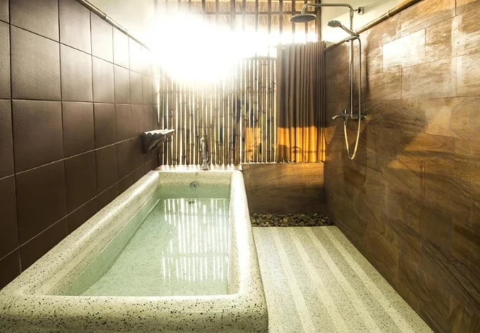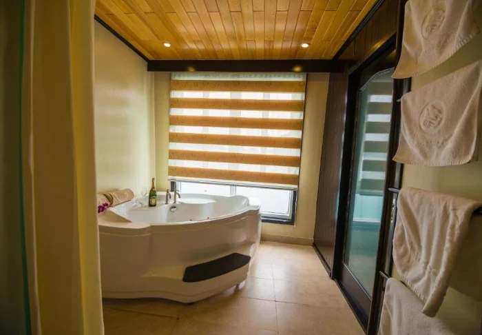 The hotel features two types of rooms: the Garden View and River View. Both room types are equipped with air conditioning, Wi-Fi, a minibar, a safety box, and a spacious bathroom with a shower and a bathtub.