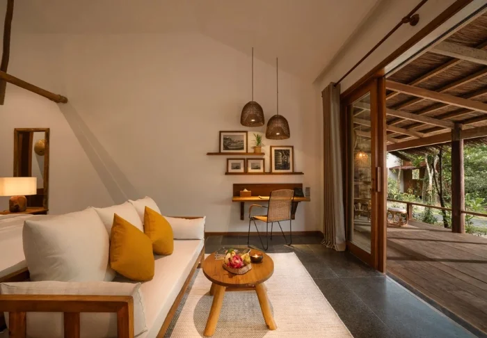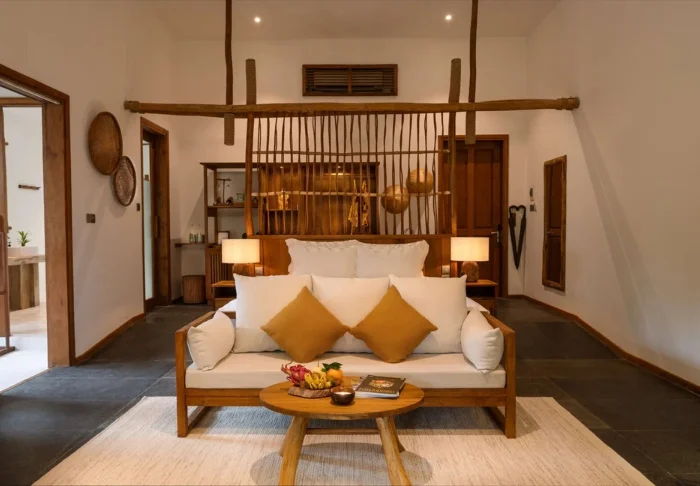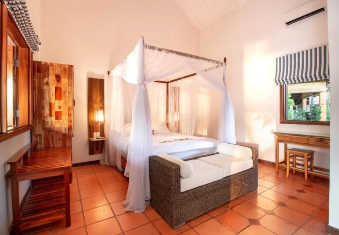 You’ll stay in a Garden Cottage, accessible via meandering paths through the hotel’s lush, palm-shaded gardens blanketed in blooms. From your terrace, you’ll overlook your own little garden—if you’re lucky, you might spot ripening passion fruit, or bright orchids and hibiscus. The room itself is simply styled, with stone floors and large windows that flood the space with natural light. You’ll also have a four-poster bed with a mosquito net, air conditioning and a ceiling fan, Wi-Fi, a minibar, tea and coffee facilities, a safety box, and a bathroom with a rainfall shower, hairdryer, and toiletries—everything you need for a truly relaxing stay.