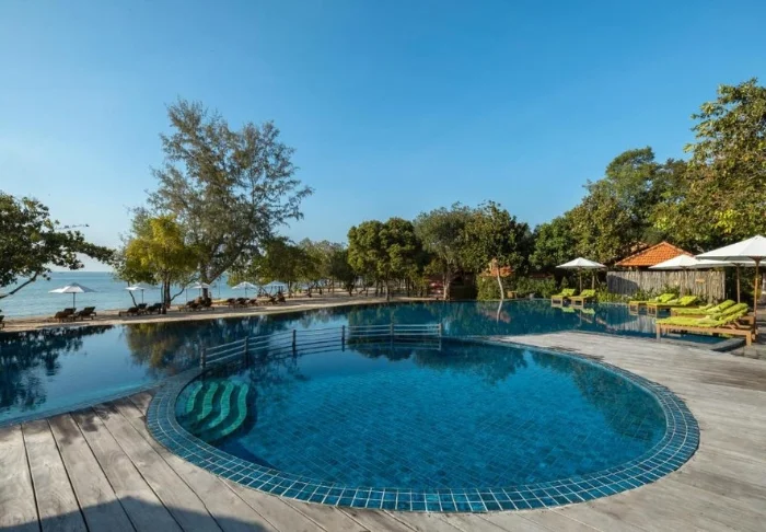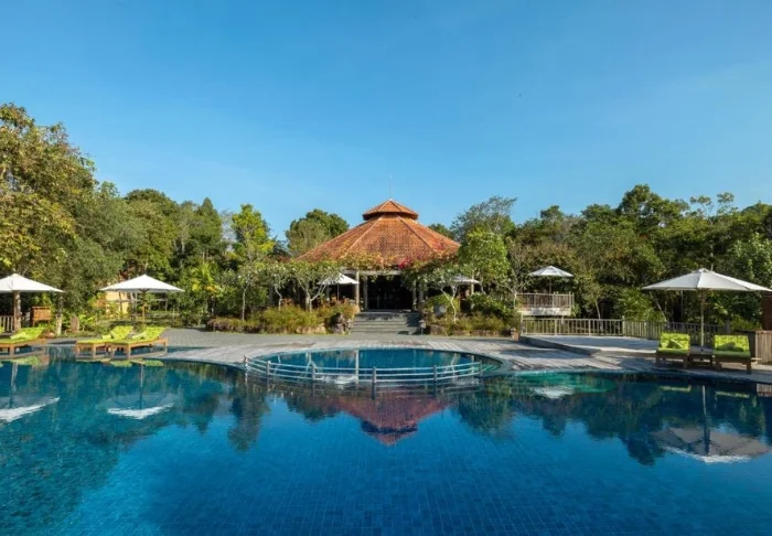 The resort’s pool overlooks the river and is surrounded by sun loungers and parasols. At the Oasis Spa, you can indulge in relaxing treatments amidst lotus ponds and fruit trees.