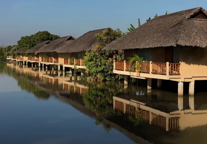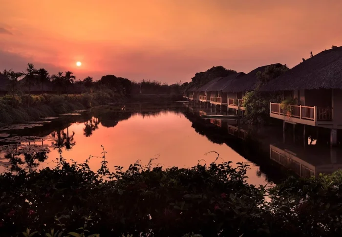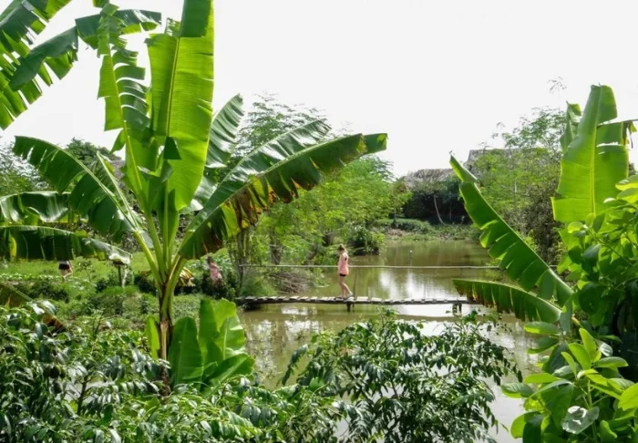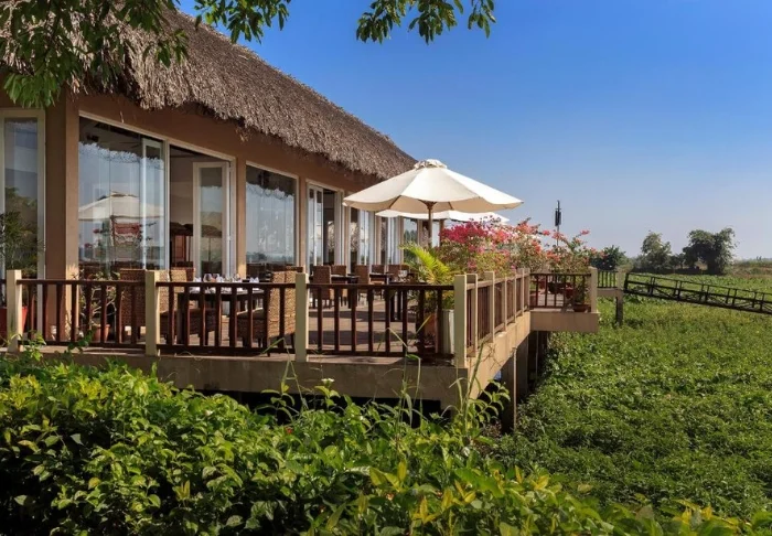 The resort boasts a beautiful garden filled with lush palms and colourful flowers, as well as an outdoor pool where you can swim or simply relax in the shade, taking in views of the river. If you’re keen to explore, the resort offers bicycle hire and can help organise trips out into the labyrinthine waterways of the delta.