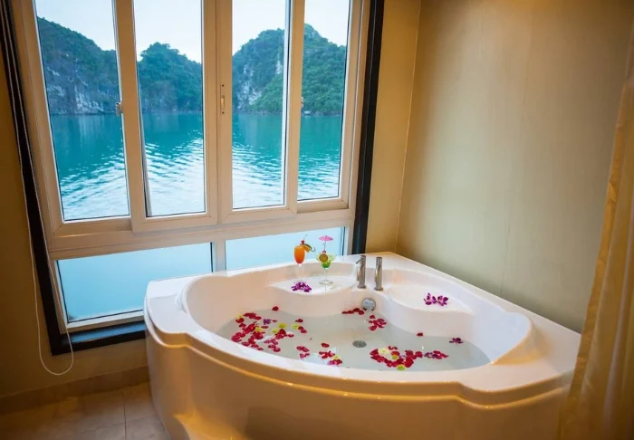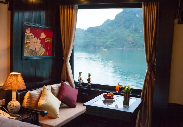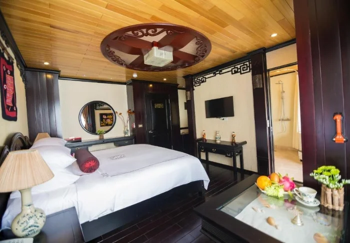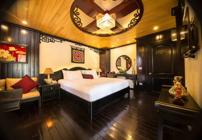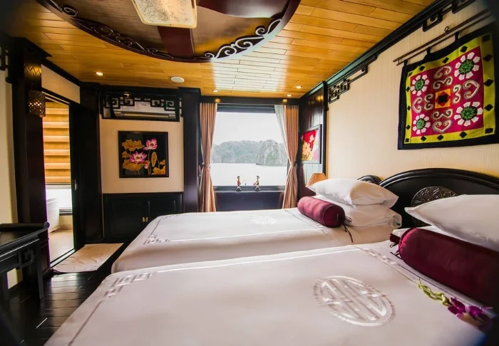 The ship features 24 cabins across two decks, each inspired by traditional Vietnamese craftsmanship and culture. Cabins are adorned with dark wood panelling, intricate décor, and large panoramic windows overlooking the bay. All are equipped with air conditioning, a minibar, a safety box, tea and coffee facilities, and a bathroom with both a bathtub and separate shower. These spacious cabins combine warm materials with modern comforts, providing an inviting retreat between each day’s adventures.