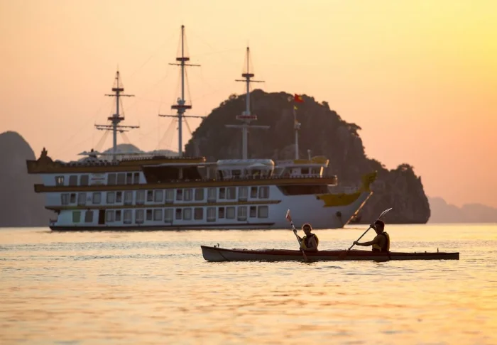 On board, you’ll find both a sun deck and a restaurant, where freshly caught seafood and Vietnamese favourites are served as the ship glides through breathtaking scenery. During the day, the boat docks at deserted islands and tiny fishing villages. You can join excursions by kayak, explore caves, or simply leap into the water straight from the boat’s stern. Evenings bring tranquillity, silence, and a sky full of stars, perhaps enjoyed with a cold drink on the deck.