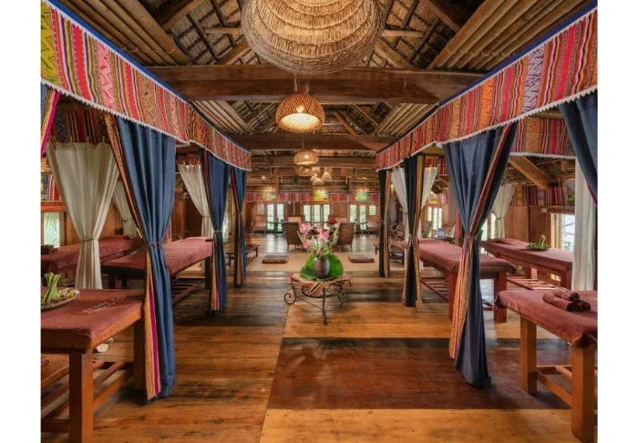 The 31 traditional bungalows are built from local materials such as wood, bamboo, and stone, blending seamlessly into the surrounding landscape. You’ll stay in a deluxe room as standard, situated in a single-storey, detached bungalow. The 45 m² room is designed in the style of the region’s traditional Thai houses, featuring wooden furniture, embroidered fabrics, and bamboo details. Large glass sliding doors open onto a spacious balcony overlooking the rice terraces and the valley, offering breathtaking views of the mountains and the surrounding scenery. On the balcony, you’ll find both a table and sun loungers — the perfect spot to sit back, relax, and soak in the tranquillity of the area. The rooms are furnished with a double bed, which can be separated into two singles, as well as a sofa bed. Amenities include air conditioning, a safety box, Wi-Fi, tea and coffee-making facilities, and a bathroom equipped with a shower, hairdryer, and toiletries.