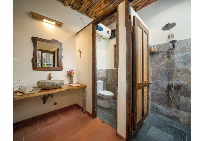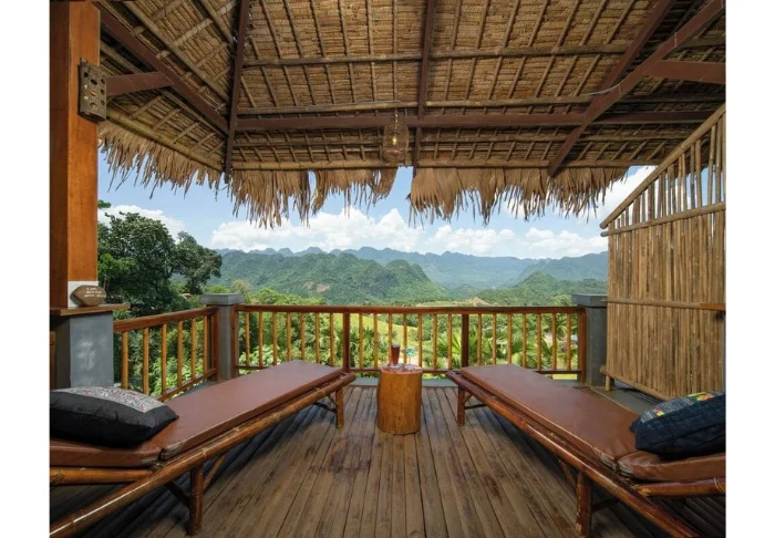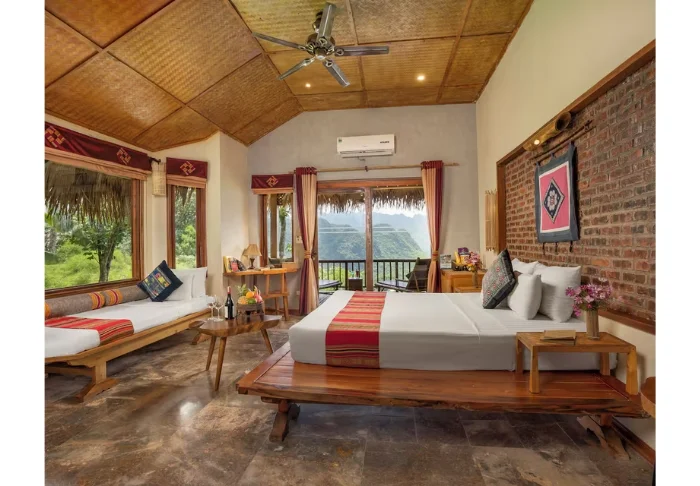 You’ll stay as standard in a 32 m2 Deluxe Valley View room overlooking some of the area’s most beautiful rice terraces. The room is built using wood and bamboo, with walls and ceilings clad in natural materials that reflect Pu Luong’s traditional architectural style. The curtains are decorated with embroidered details hand-sewn by local Thai women, adding a warm, personal touch. The room features a king-size bed and an extra bed suitable for two adults and one child. From the balcony, you can enjoy the morning sun with a cup of Vietnamese coffee as the valley slowly wakes. The room also includes air conditioning, a minibar, a kettle, and a bathroom with a shower and hot water.