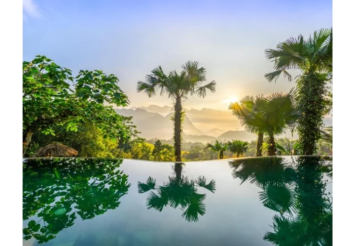 The hotel’s pool sits in the open air in the garden, surrounded by green trees, palms, and the steep limestone mountains. Around the pool, you’ll find sun loungers and lounge seating, all inviting you to unwind.