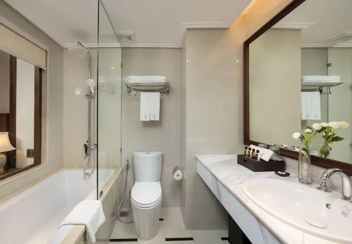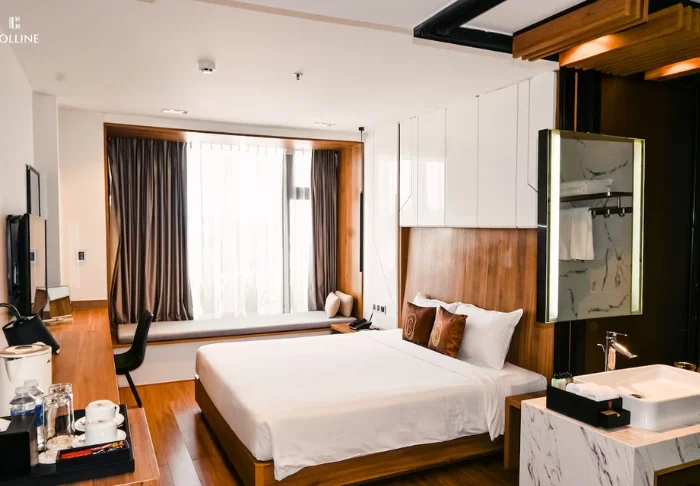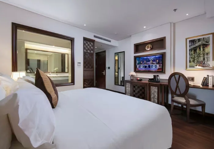 You’ll stay in a superior room decorated in the classic Vietnamese style, featuring dark wooden furniture and warm tones. The interior is simple yet practical, and the room comes equipped with air conditioning, Wi-Fi, a minibar, coffee and tea facilities, a safety box, and a flat-screen TV. The bathroom includes a shower, bathrobe, hairdryer, and complimentary toiletries.