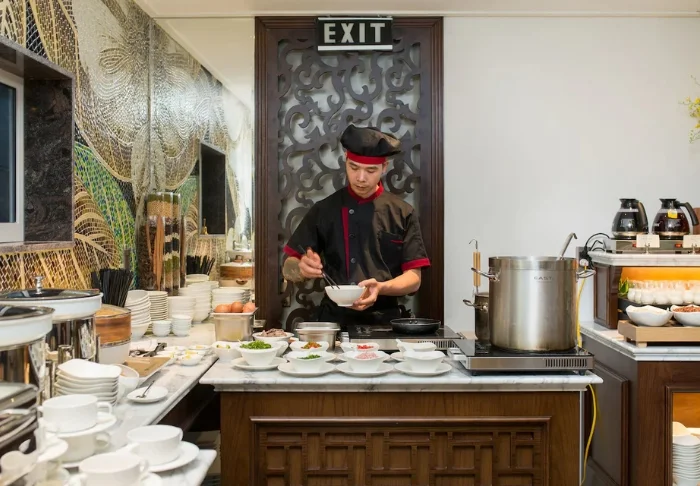 The restaurant serves a breakfast buffet along with local dishes and Vietnamese classics for lunch and dinner.