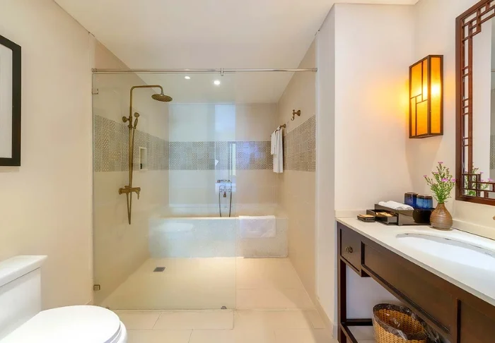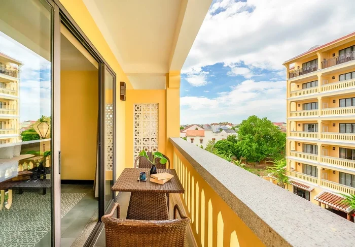 Your standard accommodation is in one of the hotel’s deluxe rooms of around 40 m², featuring either a king-size bed or two single beds. The décor is bright and welcoming, with warm colours, dark wooden furniture, and decorative lanterns that add a local touch. Each room comes with air conditioning, Wi-Fi, a minibar, tea and coffee-making facilities, a TV, a desk, and a private balcony. The bathroom includes a hairdryer and complimentary toiletries.