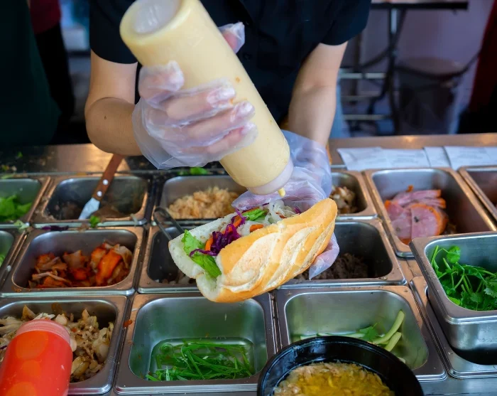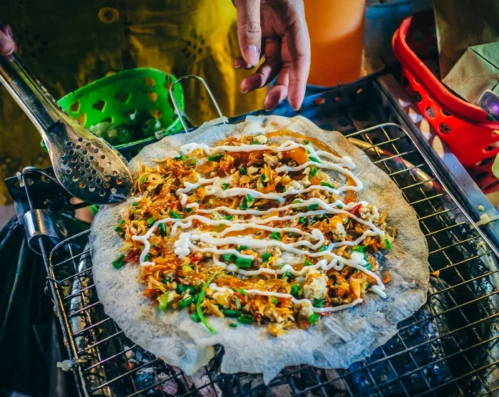 From here, you’ll stroll at a leisurely pace through the street, experiencing how pop-up eateries appear as dusk falls. Along the way, pause to taste Vietnamese rice paper pizza, banh trang nuong, as well as the iconic crispy banh mi sandwich, a delicious fusion of French and Vietnamese flavours.