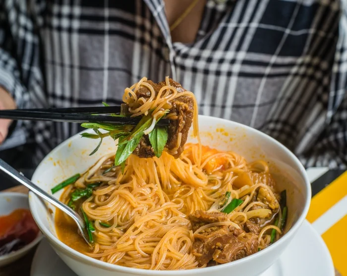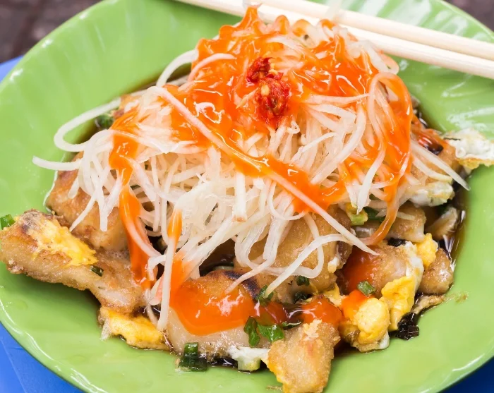 Your culinary journey finishes with a bowl of hu tieu – a noodle dish served either as a soup or dry – and the ever-popular street food dish bot chien. This treat features small cubes of fried rice flour – crispy on the outside and soft in the centre – fried together with egg and spring onion, accompanied by a sweet-sour soy-based sauce and freshly grated papaya. It’s a simple yet incredibly tasty dish, enjoyed by many locals as a late-night snack.