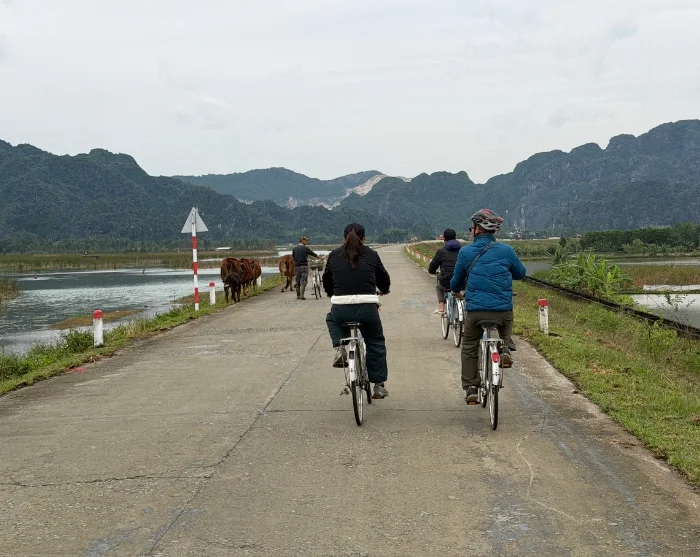 Afterwards, you’ll cycle back to the starting point – it only takes a few minutes. You’ll leave your bike there and continue by car to Van Long, where you board a traditional rowing boat and glide quietly through the peaceful nature reserve. Here, you’ll experience tranquil wetlands, striking limestone cliffs, and a wealth of birdlife, all combining to create a wonderfully atmospheric setting. The limestone mountains rise dramatically above the water, their lush greenery reflected beautifully on the mirror-like surface.
