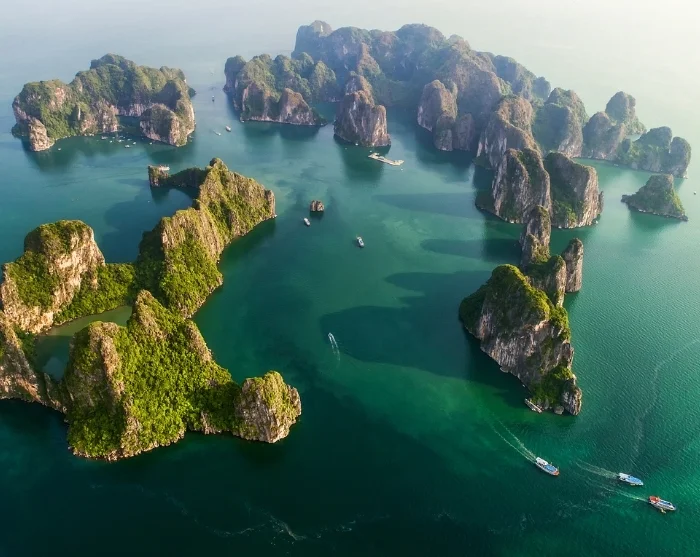 In the 1,500 km² bay, green-clad limestone cliffs protrude from the sea, which varies from deep blue to jade green depending on the season.