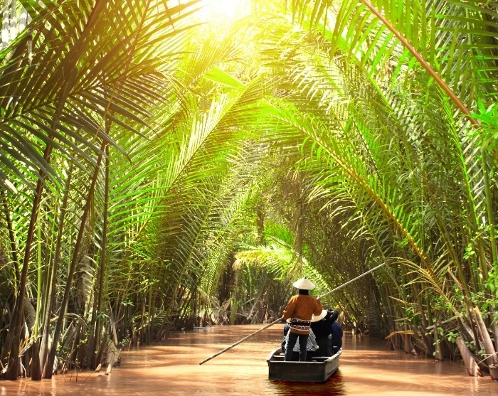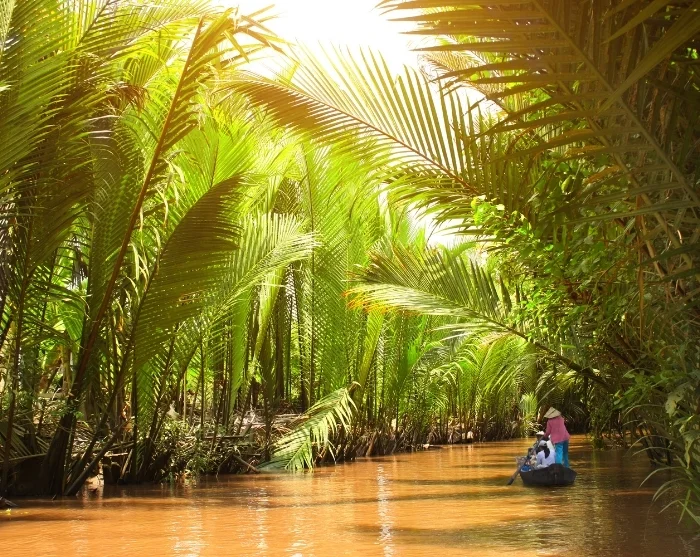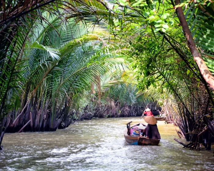 On a full day excursion, you can experience the Mekong Delta from a boat. The Mekong Delta is a lush area that covers an area just shy of 40,000 m2, much of which is under water. From its source, the Mekong River runs 4,500 km through six countries to the delta at the coast south of Ho Chi Minh City. On the boat trip, you can visit some of the local craftsmen and producers – at a coconut plantation, for example.