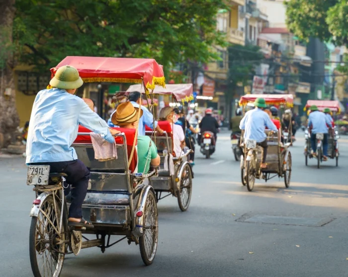 The tour then continues by traditional cycle rickshaw – also known as a cyclo – winding through the old quarter’s maze of narrow streets and bustling trade. The old quarter is famous for its 36 streets, each originally named after the goods once sold there: bamboo, silk, paper, and tin. Many of these street names have survived to this day, and the atmosphere is still brimming with local charm, where Hanoians shop, chat, and serve steaming bowls of pho from street kitchens.