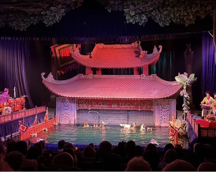 The day’s sightseeing tour concludes with a performance at a water puppet theatre – a centuries-old Vietnamese tradition where puppets dance gracefully across the water’s surface, accompanied by live music and a classic narrative.