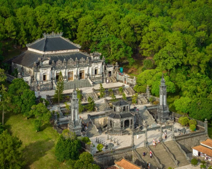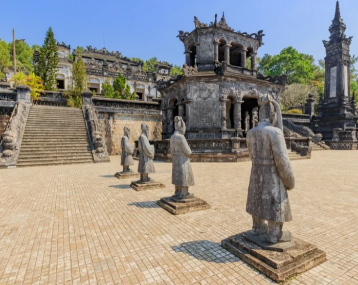 Your journey then continues to the tomb of Emperor Khai Dinh, which stands out distinctly from the other imperial tombs in the area. The complex was built in the early 1900s and combines traditional Vietnamese design with European baroque and gothic influences. The result is a grand and intricately detailed architectural masterpiece that reflects the emperor’s fascination with Western art and culture. The tomb is beautifully situated at the foot of Chau Chu Mountain, around 9 km south of Hué.