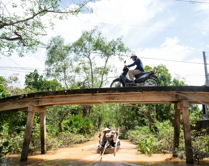 After around 2.5 hours on the road, you’ll reach the town of Cai Be. Here, you’ll board a boat to begin your journey into the lush Mekong Delta. You’ll visit local workshops where skilled artisans craft products from coconut. Your journey continues aboard a small sampan—a traditional, hand-rowed wooden boat—taking you through the Mekong Delta’s narrow, winding channels.
