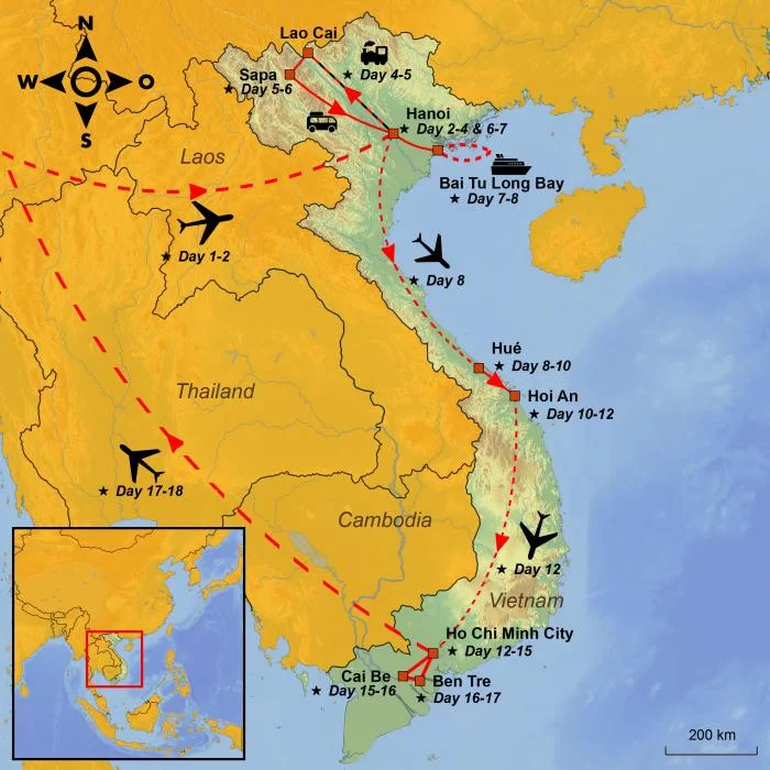 Look forward to an adventurous tour through Vietnam – from the mountainous region of Sapa and the vibrant capital of Hanoi to ancient imperial cities, charming coastal towns, the lush Mekong Delta, and the buzzing metropolis of Ho Chi Minh City in the south.