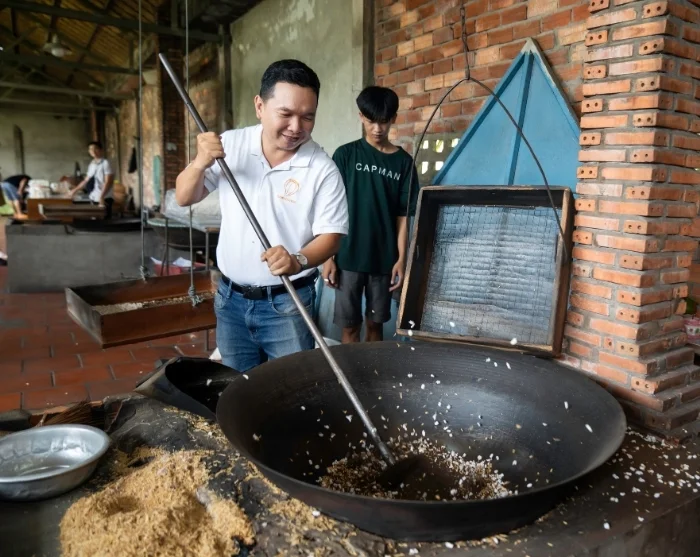 Your tuk-tuk will take you along the mellow roads of the village. The first stop is at a local family’s home, where you’ll get to taste com dep (green rice flakes) and see how popped rice is made.