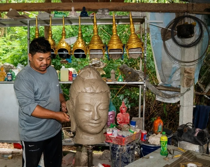 The tour continues with a visit to a talented Khmer artist, who creates statues and masks for the area’s pagodas.