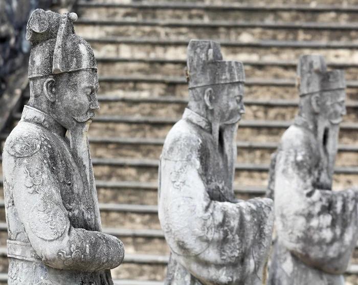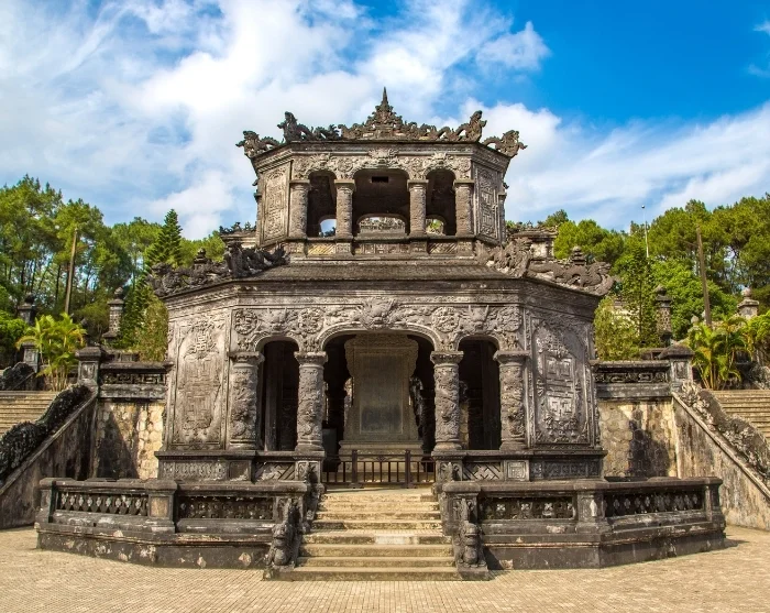 The tour continues to the tomb of Emperor Khai Dinh, which stands apart from the other imperial mausoleums in the area. Constructed in the early 1900s, this tomb masterfully blends traditional Vietnamese design with elements of European Baroque and Gothic architecture. The result is an extraordinary and intricate structure that pays tribute to the late emperor, and also reflects his fascination with Western art and culture.