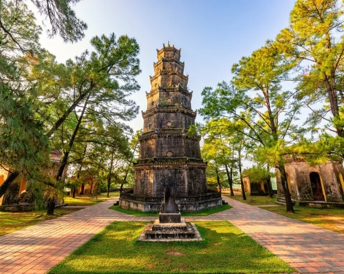 Your next stop is the Thien Mu Pagoda, Hué’s oldest and most iconic religious landmark. Perched high above the Perfume River, this pagoda has served as a vital centre for Buddhism in central Vietnam for over 400 years. Its octagonal tower rises majestically into the sky, providing a tranquil setting for the temple and the monastic community that continues to live and practise here.